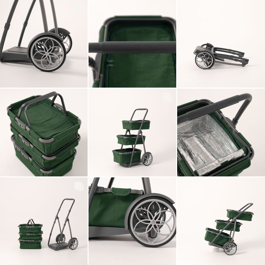 The Marketday Cart was an idea that came to us one Sunday morning at a farmer's market. Why were we struggling with a single deep bag, jostling all the things? Could we make something that was better?